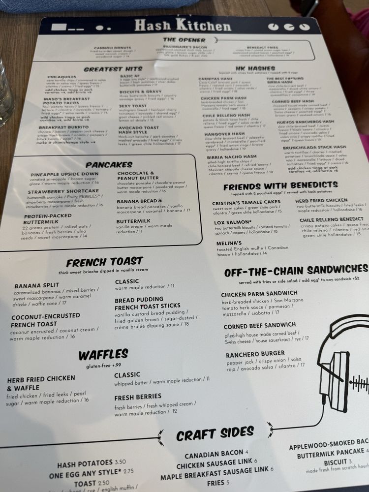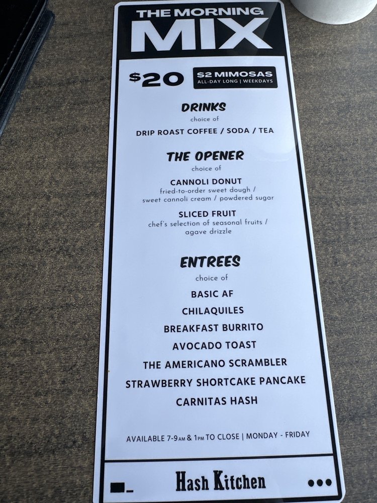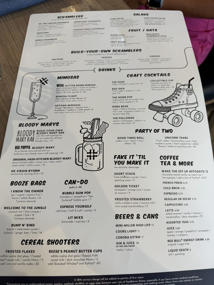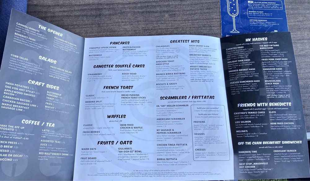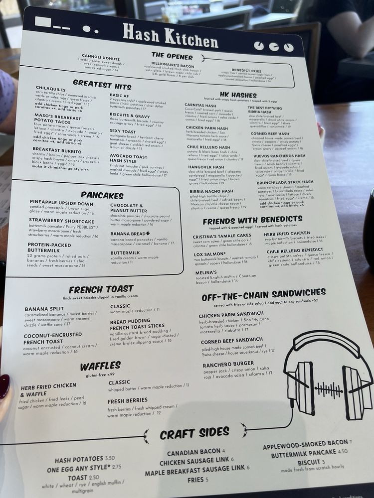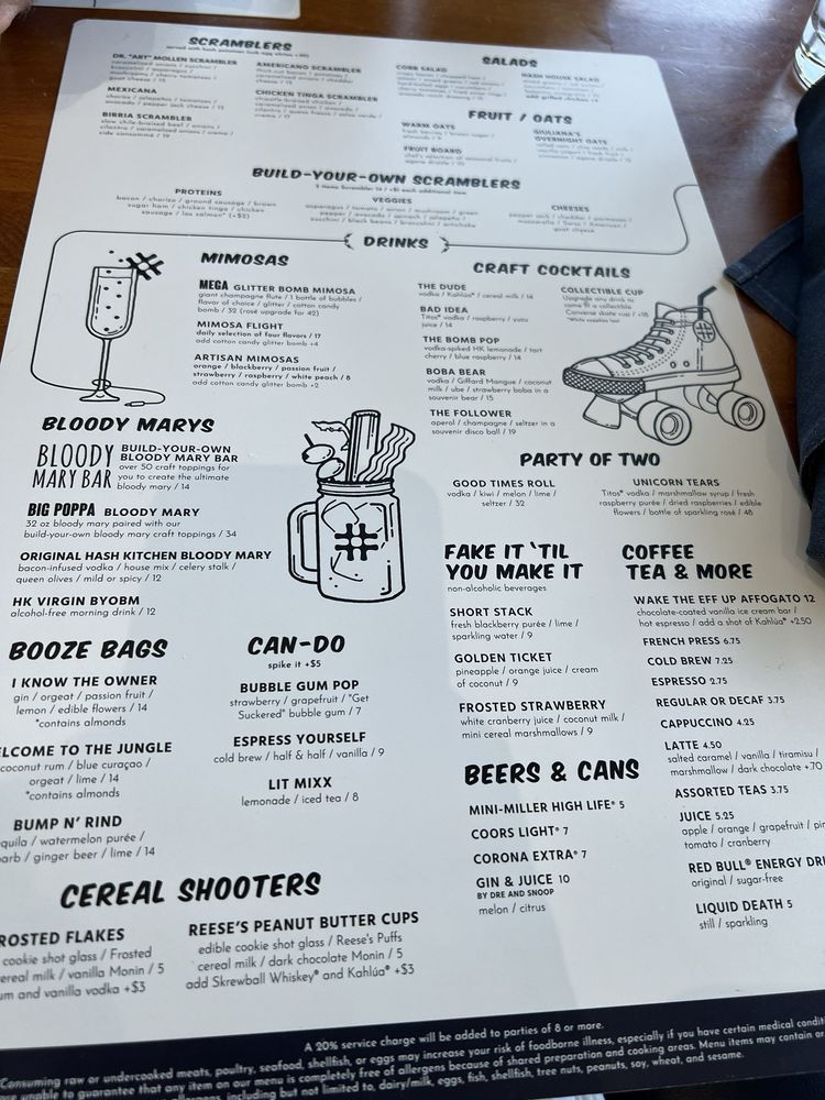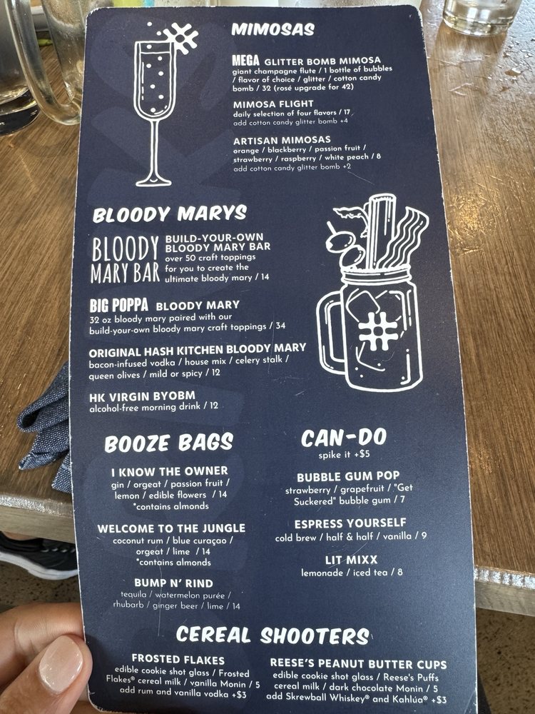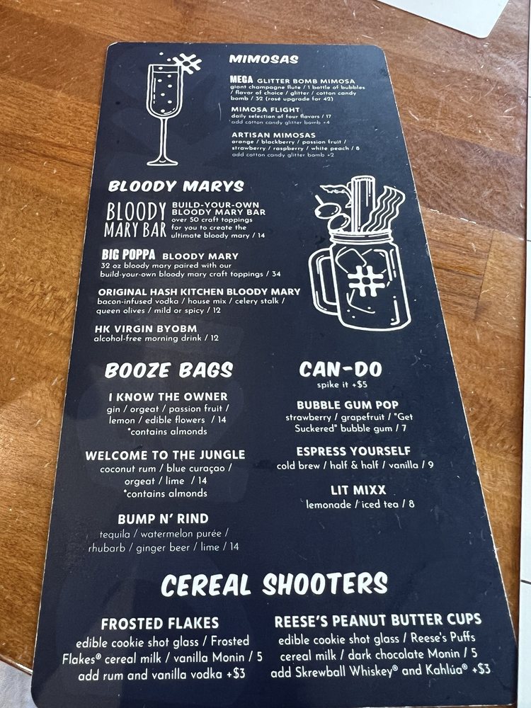 Introducing the menu at Hash Kitchen, a trendy and casual restaurant in Scottsdale, Arizona, offers a diverse menu with vegan and vegetarian options. The restaurant provides delivery, takeout, and reservations, making it convenient for all diners. The extensive drink menu includes creative options like Bubble Gum Pop and Wake the Eff Up coffee. Customers rave about the lively atmosphere, with DJ music and a build-your-own Bloody Mary bar. The food offerings range from sweet to savory, with standout dishes like corned beef hash and strawberry shortcake pancakes. The attentive staff and exceptional service add to the overall enjoyable dining experience at Hash Kitchen. Their unique dishes and fun atmosphere make it a must-visit spot for brunch or lunch.